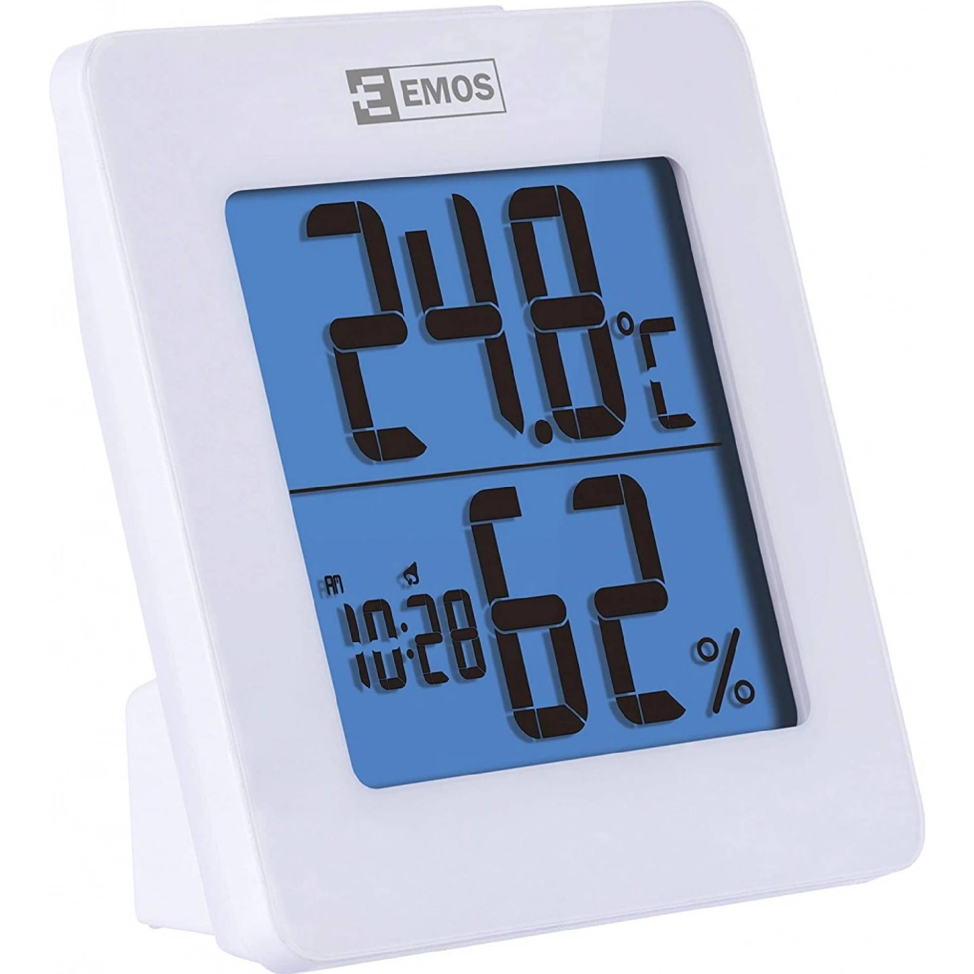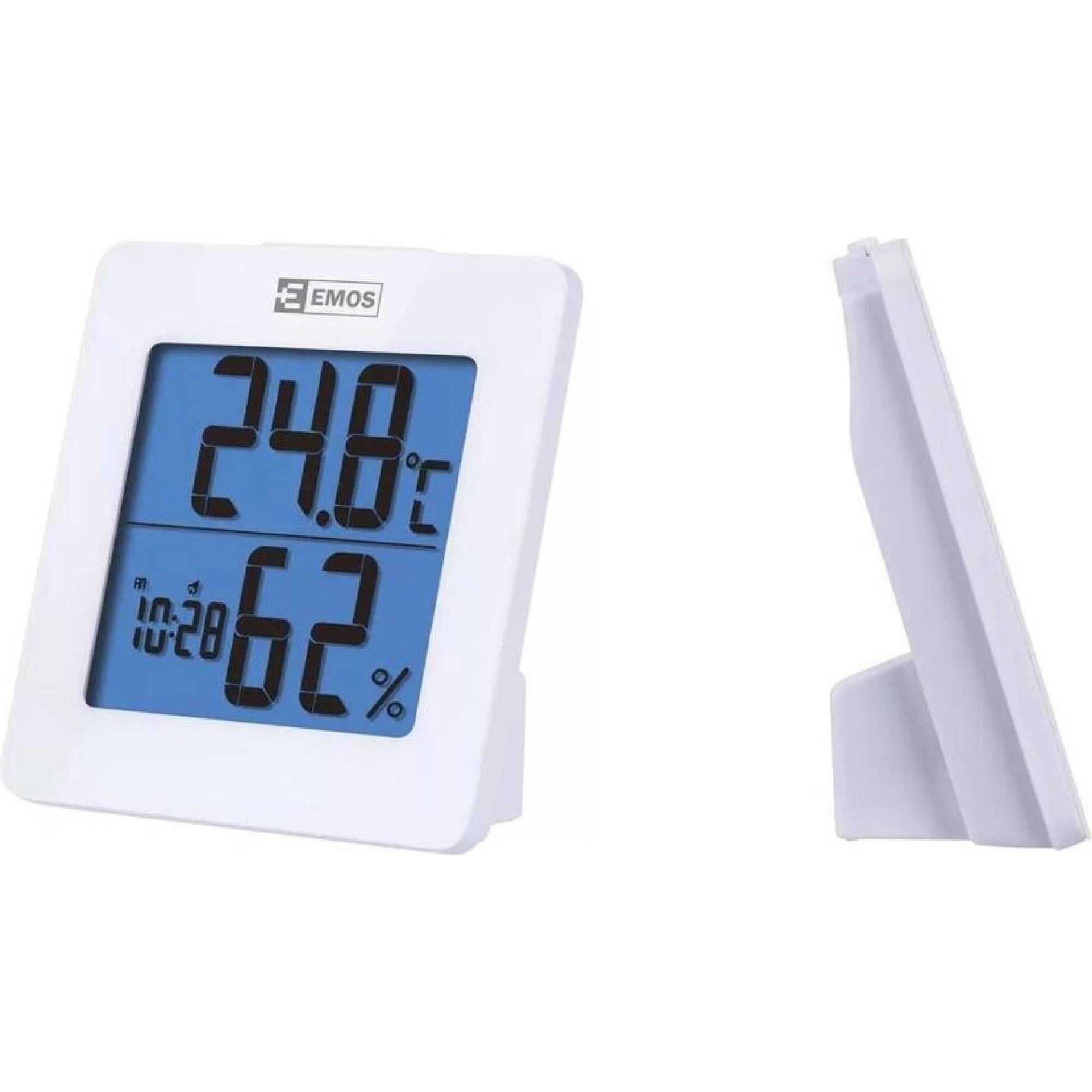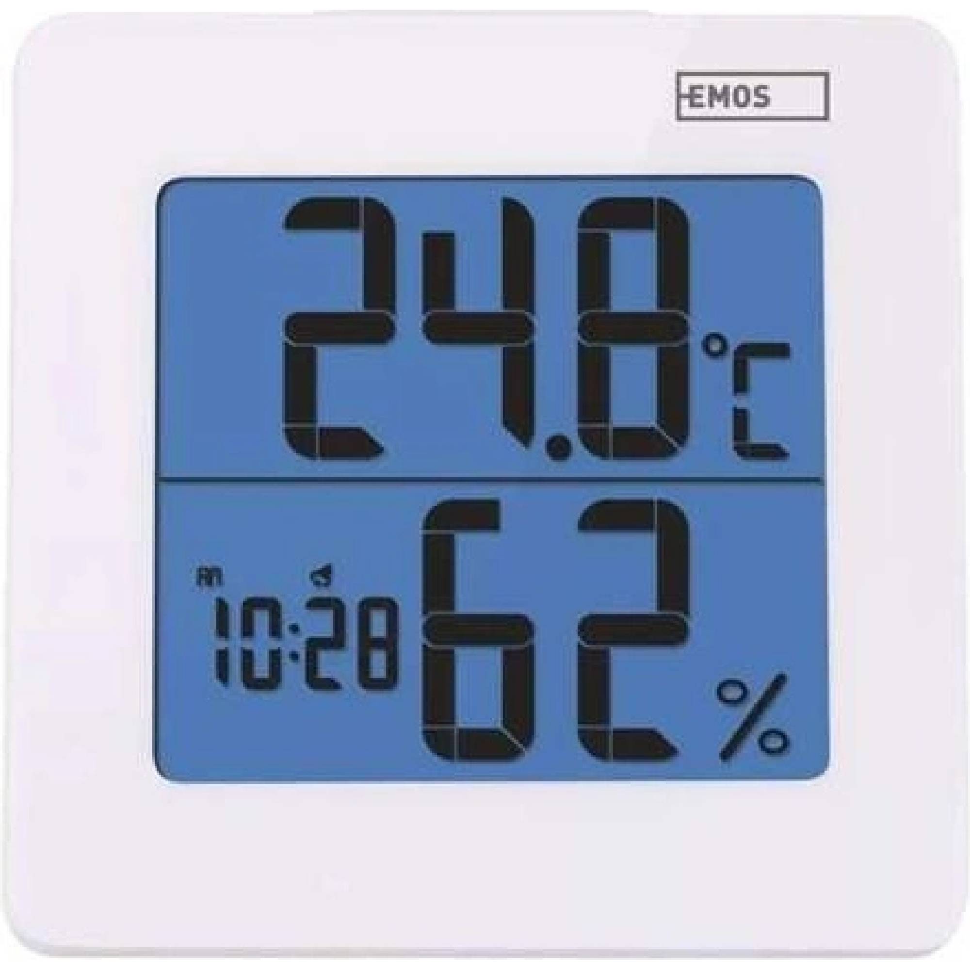 Teplomer v bielej farbe s hodinami riadenými Quartz kryštálom. Teplomer má podsvietenie displeja, zobrazuje vnútornú teplotu a vlhkosť, hodiny, dátum a má budík.