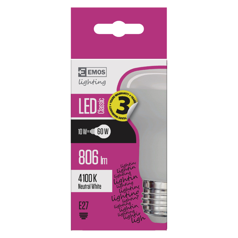 LED žiarovka Emos Classic - R63 - výkon 10W -> náhrada za žiarovku 60W - závit E27 - farba svetla: neutrálna biela - 4100K - energetická trieda A+ - životnosť 30 000 hodín - 3 roky záruka Celý popis