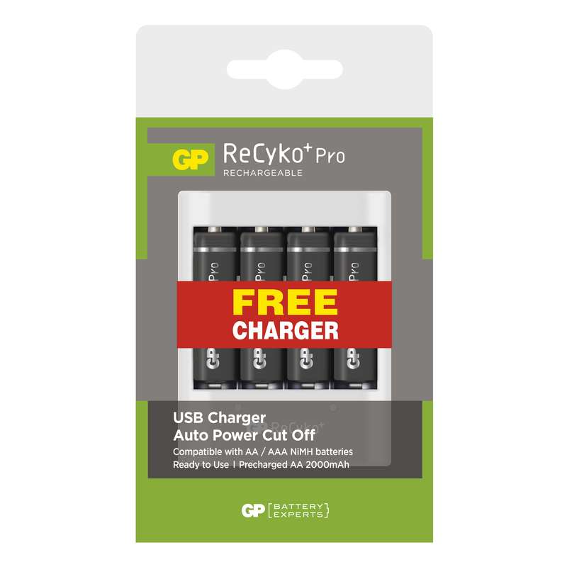 Nabíjačka batérií GP spolu s 4 batériami v balení - Recyko+ Pro je nástupca legendárnej batérie Recyko+ - viac ako 1500 nabíjacích cyklov - prednabité od výroby - zloženie: NiMH - možnosť nabíjať 2 alebo 4 batérie naraz - kombatibilné s AA/AAA NiMH batériami - LED indikácia nabíjania - micro USB kábel na nabíjanie v balení